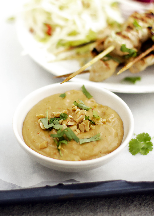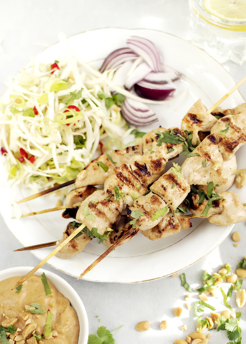 Podaj ciepłe szaszłyki z kurczaka z coleslaw, ciepłym orzechowym sosem, czerwoną cebulą, limonką i ziemnymi orzeszkami. Dla bardzo głodnych proponuję biały ryż ugotowany na sypko. Smacznego!