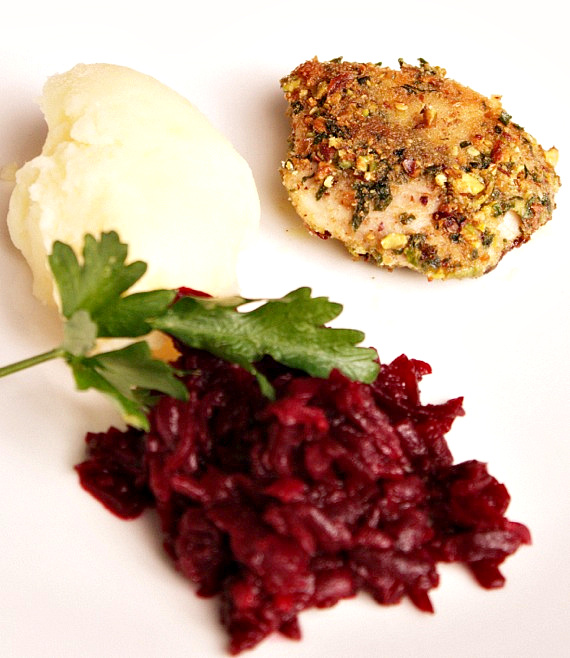 Niby takie proste, typowe, polskie danie: ziemniaczane puree, panierowany kurczak i sałatka z buraczków na ciepło, a jak inaczej smakuje. A właśnie, buraki, to jedno z moich ulubionych warzyw… Sałatkę z buraczków zrobiłam na ciepło, ale letnia czy zimna jest równie dobra. Wspaniałe kolory na talerzu…