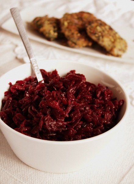 - Ugotowane buraki zetrzyj na tarce o grubych oczkach razem z jabłkiem. Cebulę pokrój w drobną kostkę i zeszklij na oliwie. Dodaj buraczki , jabłko, dopraw miodem, octem i przyprawami.