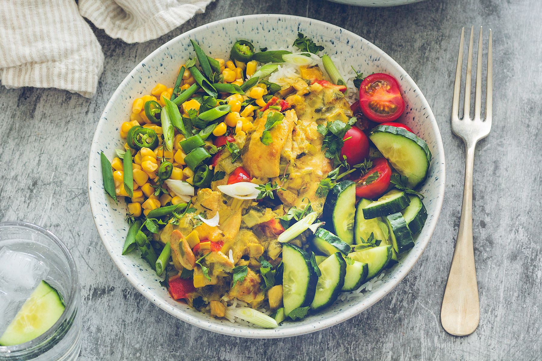 kukurydza, ogórek, pomidory koktajlowe, dymka