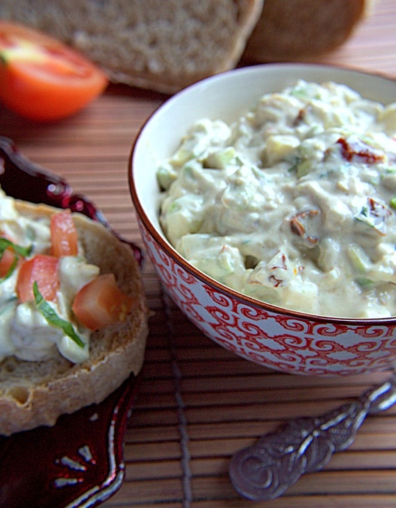- Wymieszaj wszyskie składniki z crème fraîche. Dopraw sokiem z cytryny, oliwą, solą i pieprzem.