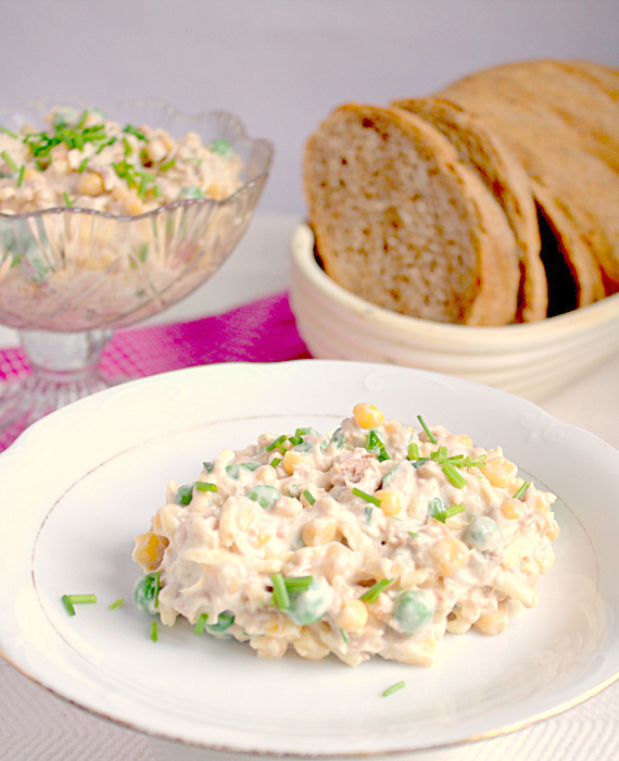 Lekkie sałatki, a zwłaszcza sałatka z tuńczykiem, którą można zrobić na tysiące sposobów po prostu uwielbiam i przyrządzam bardzo często. Dzisiejsza sałatka z tuńczykiem nie zawiera aż tyle świeżych warzyw. Skupiłam się na kukurydzy i zielonym groszku. Ponieważ użyłam tuńczyka w zalewie, więc pozwoliłam sobie na odrobinę majonezu wymieszanego z jogurtem.
