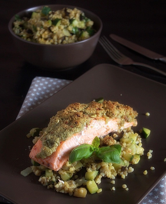- Pokrój bakłaża,cukinię, cebulę w kostkę, a czosnek w plasterki. Smaż na oliwie do miękkości, po czym dodaj ugotowany, ciepły bulgur i lekko porwane liście bazylii. Wymieszaj delikatnie i podaj razem z upieczonym łososiem.
