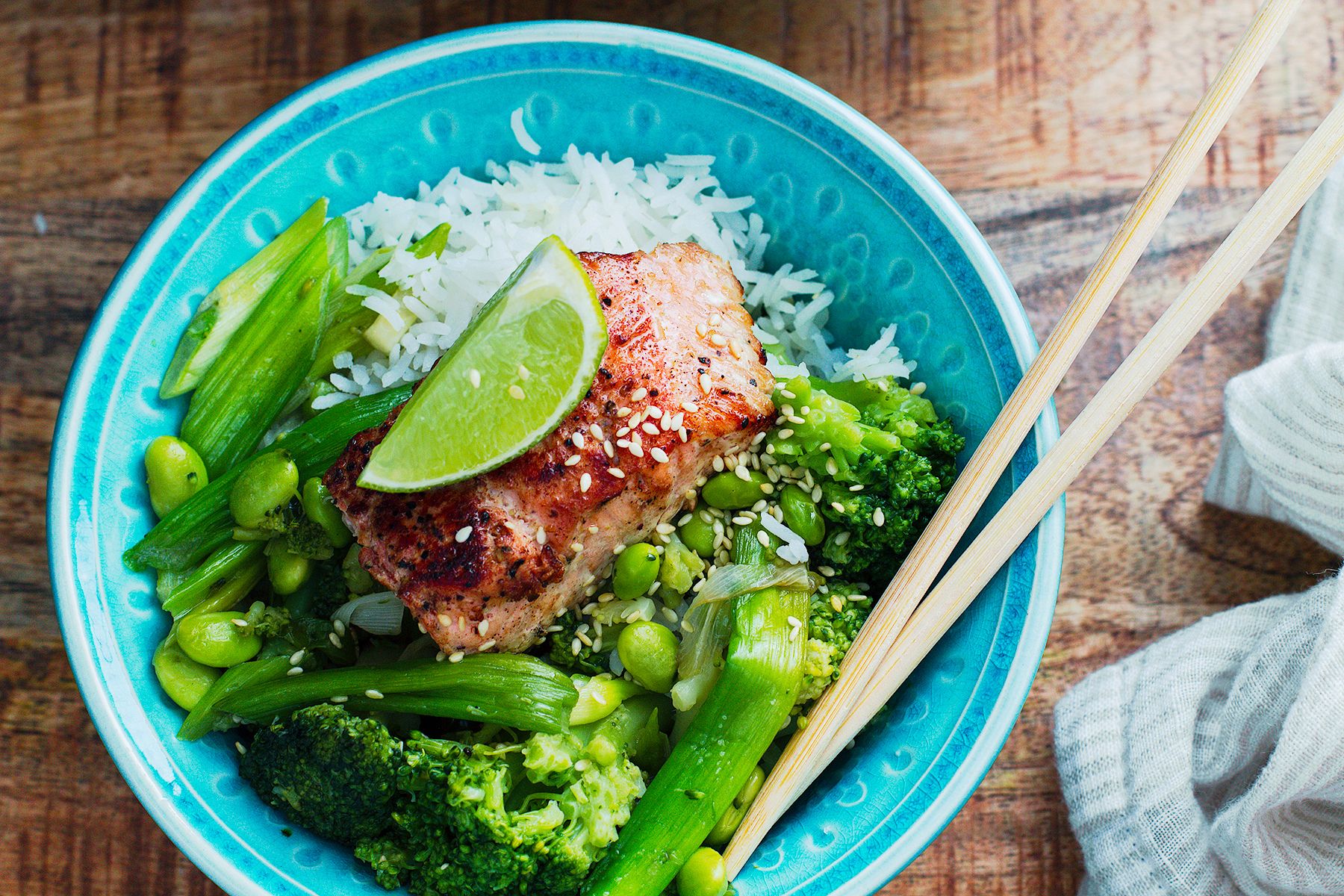 - Dodać resztę marynaty i usmażyć warzywa al dente. Ewentualnie doprawić warzywa solą. Podać łososia z warzywami, limonką i ryżem. Przed podaniem posypać prażonym sezamem. Smacznego!