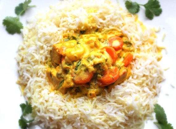 Szafranowy losos smakuje najlepiej z ryzem lub kasza. Oto przepis: