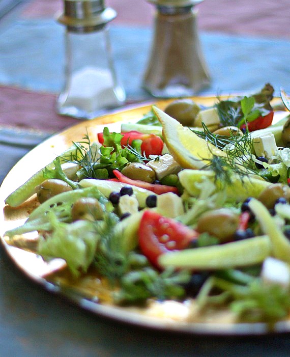 Pokrój pomidory w ósemki, a ogórki w podłużne kawałki. Ułóż sałatę na półmisku, a na niej warzywa, oliwki,cytrynę, pokrojoną feta. Całość posyp jagodami. Z oliwy, miodu i octu zrób winegret i polej nim sałatkę.