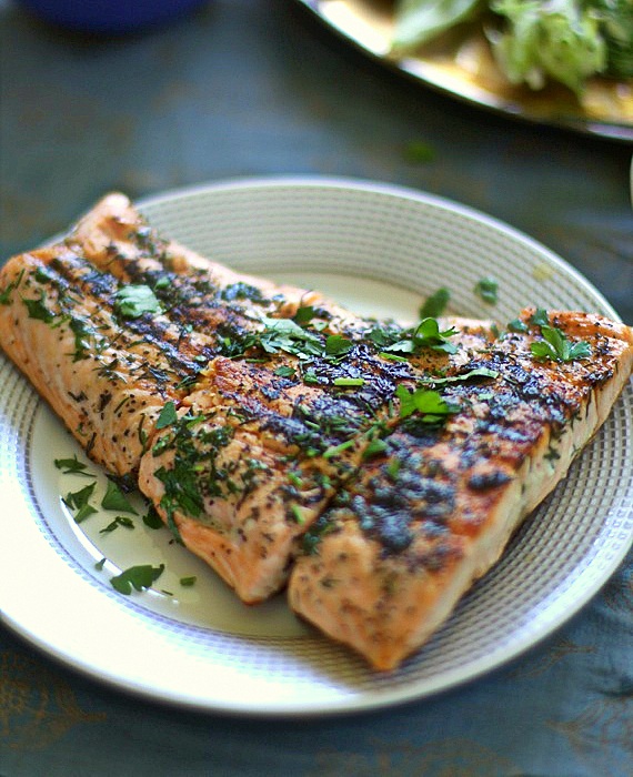 Opłucz łososia i osusz papierowym ręcznikiem. Natrzyj solą, posyp pieprzem i ziołami, skrop sokiem z cytryny. Marynuj przez godzinę po czym grilluj prze około 15 minut w zależności od grubości fileta.