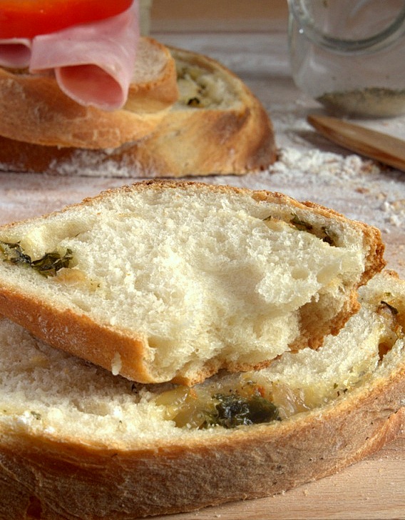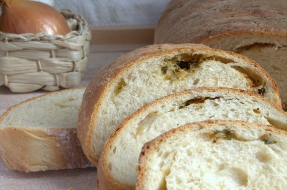 Lubię piec chleb, a jeszcze bardziej podprawiać go na wszystkie możliwe sposoby. Dzisiaj upiekłam chleb przyprawiony czosnkiem, cebulą i serem, chleb z semoliny na jeden dzień. Przy mojej domowej armii taki chleb niestety dłużej się nie uchowa.
