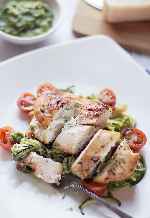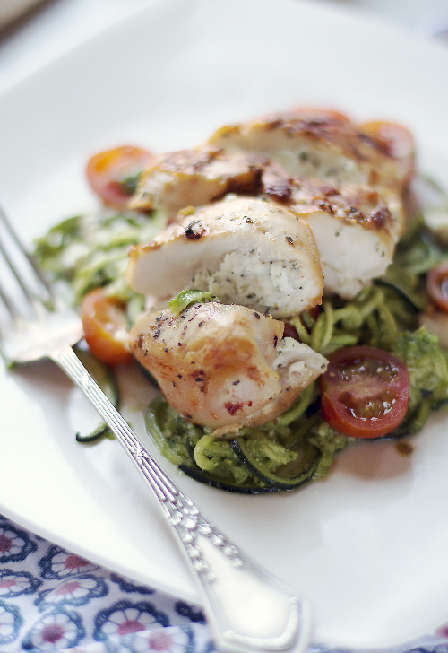 Dzisiaj proponuję proste danie z kurczaka nadzianego miętą pieprzową i serkiem ricotta. Do tego dania zazwyczaj dodaję świeżą miętę pieprzową, ale wczoraj po odwiedzeniu kilka sklepów poddałam się i użyłam suszonej. W domu jedliśmy kurczaka z ziemniakami, a do pracy zrobiłam sobie cukiniowe spaghetti, które wymieszałam z bazyliowym pesto. Pysznie i prosto.