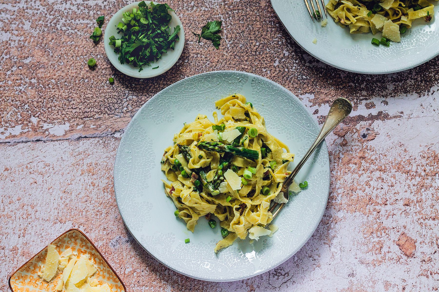 Nie będę się dziś rozpisywać o prozdrowotnych właściwościach szparagów – zrobiłam to już wczoraj i nie będę się powtarzać (choć mogłabym, bo temat wdzięczny). Za to muszę napisać, że makaron ze szparagami, tak kremowy i delikatny w smaku, rozkocha w sobie nawet najbardziej opornych. Oczywiście to nie przypadek – to zasługa domowej roboty tagliatelle, serowego sosu na bazie serka Łaciate, śmietany i parmezanu. Dla mnie ten zestaw to pewniak – sprawdza się zawsze, niezależnie od tego, czy dorzucę do niego szparagi, inne zielone warzywa, kurczaka czy nawet plasterek szynki z lodówkowego zapomnienia.