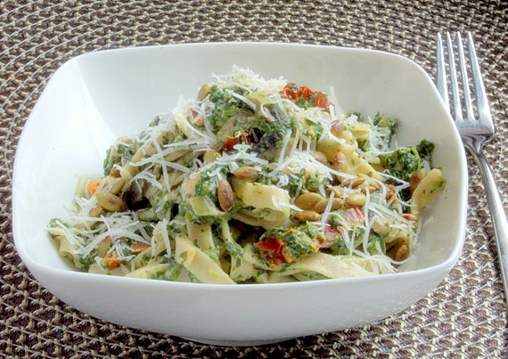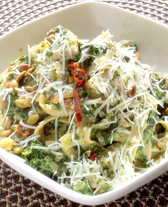 - Gotowy makaron ze szpinakiem posyp parmezanem i pestkami dynii.