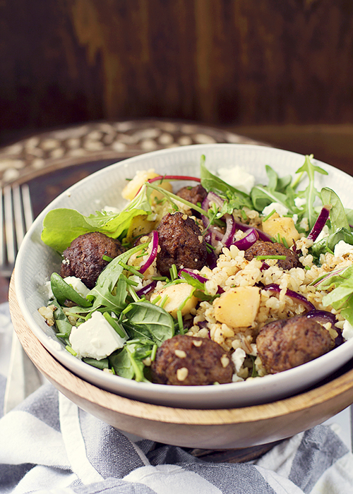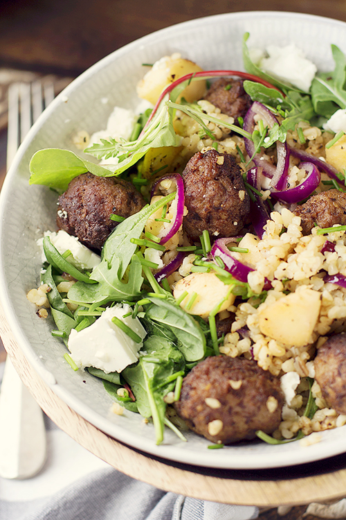 Klopsiki wykorzystałam do sałatki na ciepło z kaszy bulgur i jabłka smażonego z cebulą. Jeszcze trochę kolorowej sałaty, pokruszonej fety i apetyczny obiad gotowy. Uwielbiam sałatki na ciepło, a i reszta rodzinki też nie gardzi.