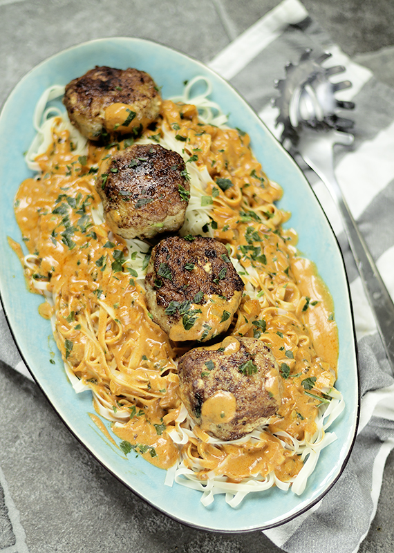 Przygotuj farsz. Pokrój drobno dymkę i suszone pomidory. Dodaj mięso, przyprawy, jajko i śmietankę. Wymieszaj farsz i uformuj 16 kotletów. Smaż na rozgrzanym tłuszczu po obu stronach, aż będą rumiane. W małym rondelku przyrządź sos. Pokrój drobno cebulę i czosnek. Zeszklij na oleju. Dodaj pokrojoną bazylię, przecier i bulion. Zagotuj sos stale mieszając, po czym dodaj śmietankę. Podaj kotlety z makaronem ugotowanym al dente polane sosem. Całość posyp pietruszką.