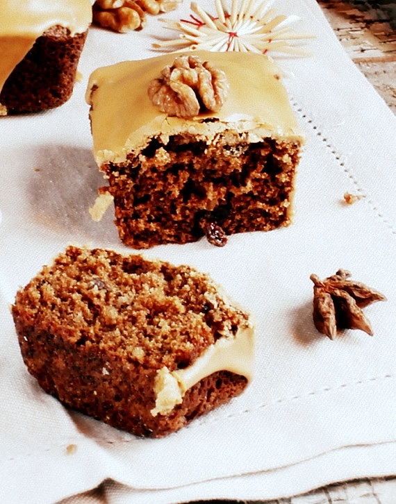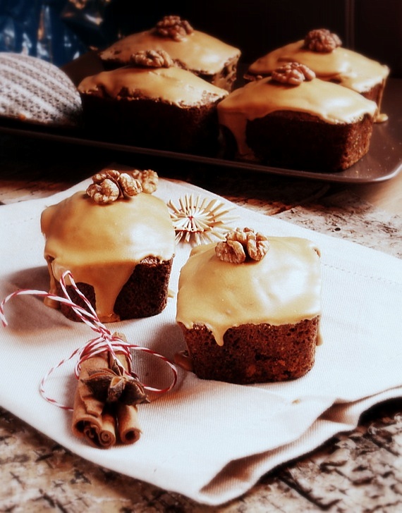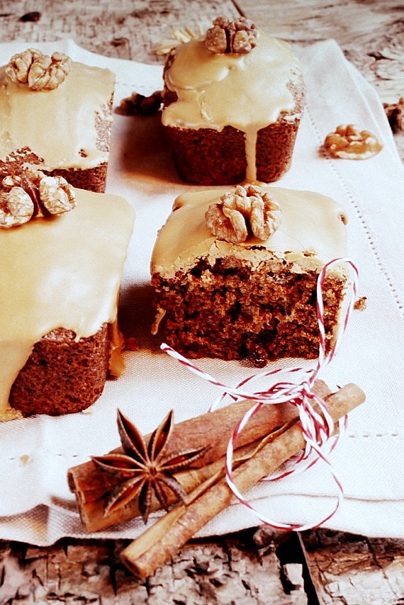 Świątecznie! Jak ja lubię te wspaniałe zapachy roznoszące się po całym domu! Dzisiaj upiekłam puszysty piernik w wersji mini, naszpikowany bakaliami, pokryty polewą z kawy. Bardzo lubię takie mięciutkie pierniki, rozpływające się w ustach.