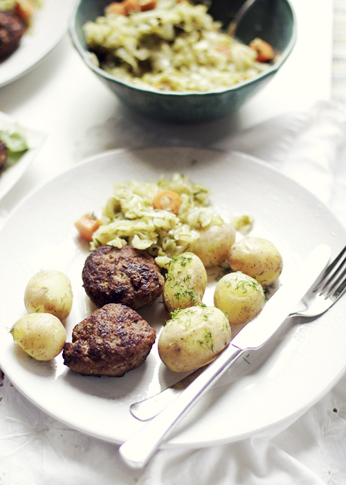 Podaj mielone z młodą kapustą i ziemniaczkami z koperkiem. Smacznego!