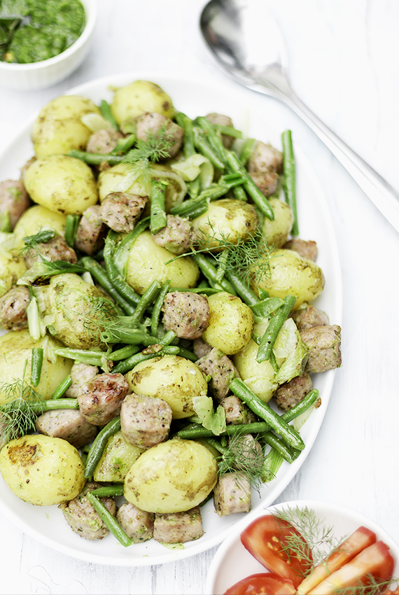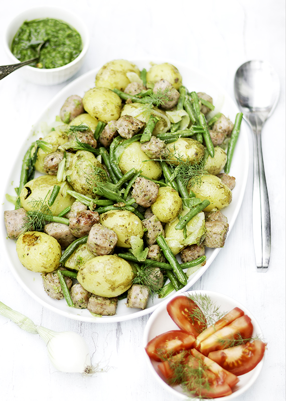 Wczoraj była u mnie premiera na młode ziemniaki. Premiera, więc musiało być wyjątkowo, ciekawie i oczywiście smacznie. Wymyśliłam młode ziemniaki z salsiccia w towarzystwie szparagowej fasolki i pesto z jarmużu. Młode ziemniaki z pesto smakują wyśmienicie! No cóż nie spróbujesz nie wiesz! Polecam to szybkie i smaczne danie na lato! Mało pracochłonne i tanie.
