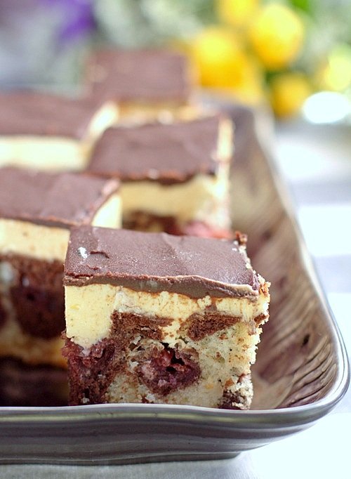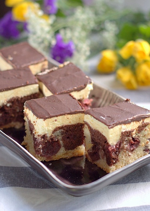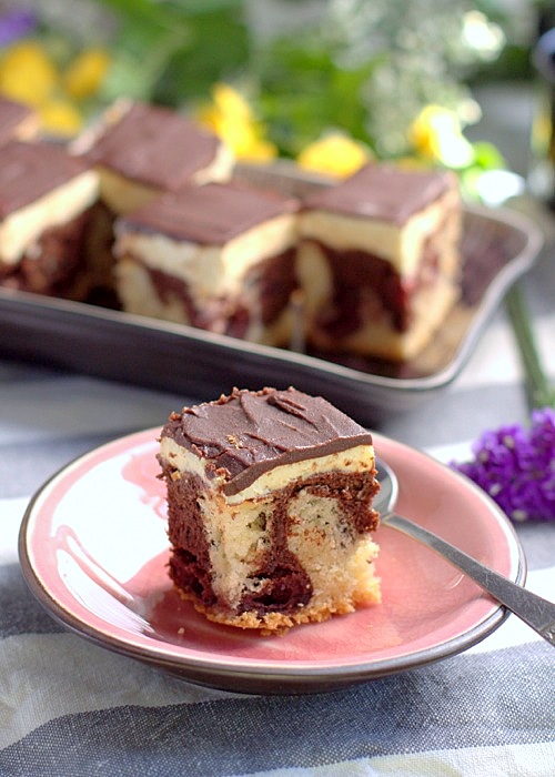 Piekę to ciasto na ogół w prostokątnej formie i kroję na przyzwoitej wielkości kawałki. Ciasto polecam, bo idzie jak woda. Poza tym jest efektowne, również dla oka.
