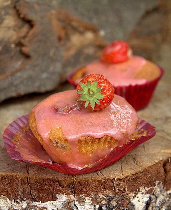 Pyszne muffinki z truskawkami i polentą udekorowałam truskawkowym lukrem i całymi truskawkami. Jak do wypieku każdych muffinek polecam foremkę do muffinek, bo same muffinkowe papilotki są za wiodkie, ciasto przelewa się, a na dodatek muffinka traci ładny kształt. Sama myślę jeszcze o kupnie foremki silikonowej…