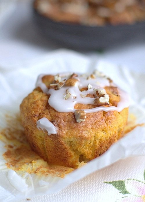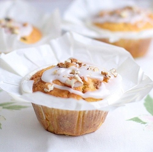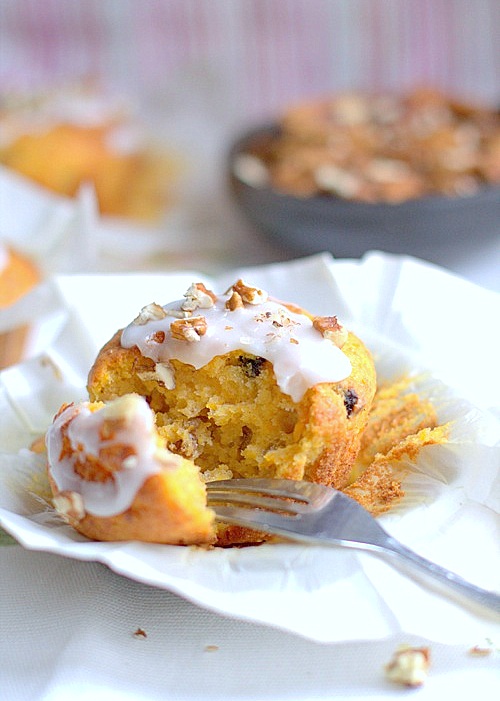 Pozwoliłam sobie polukrować muffiny i posypać resztą orzechów. Na 10 muffinów potrzeba 150 ml cukru pudru i około jednej łyżki soku z cytryny.