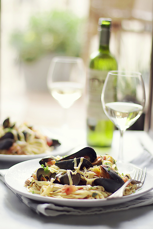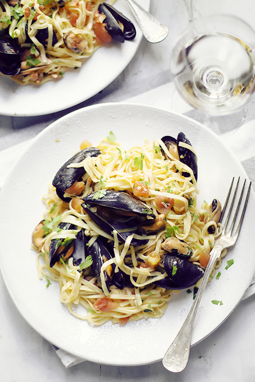 Mule w białym winie i pomidorach. Dosłownie kilka składników i pyszne danie na kolację już gotowe. Małże zazwyczaj jadam w restauracji ale od czasu do czasu próbuję własnych sił przyrządzić je samma. Jeśli lubicie skorupiaki proponuję również to niepracochłonne danie makaron z krewetkami lub spaghetti na ostro mojej siostry.
