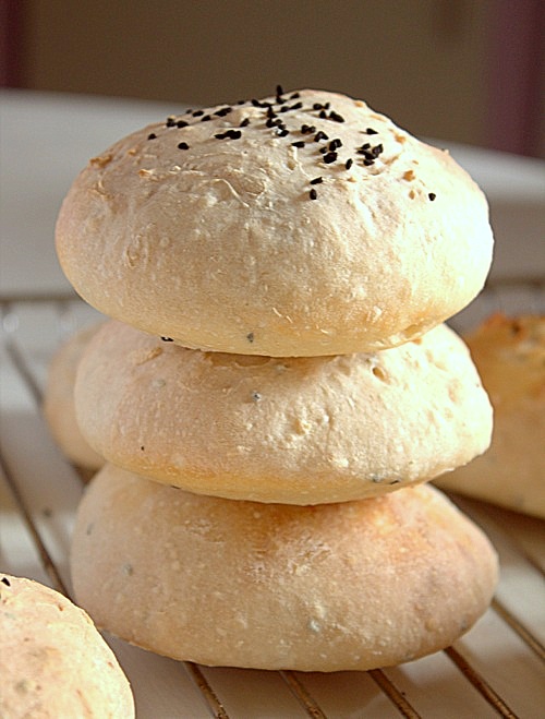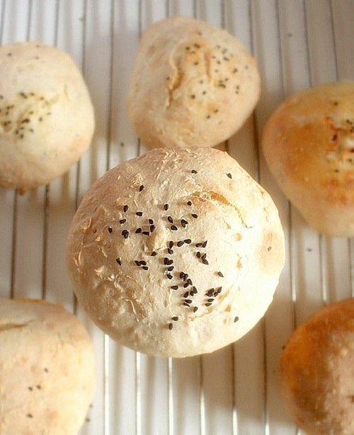 - Uformuj okrągłe, płaskie placki, ułóż na 2 blaszkach wyłożonych pergaminem, posyp czarnuszką i odstaw do wyrośnięcia na godzinę.