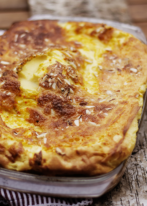 Nastaw piekarnik na 225ºC. Zmiksuj mąkę z połową mleka, solą, cukrem i szafranem, po czym dodaj resztę mleka i jajka i zmiksuj raz. Wylej roztopione masło na brytfankę i rozsmaruj, posmaruj również brzegi. Wylej masę naleśnikową, posyp migdałami i piecz naleśnik 20 – 25 minut.