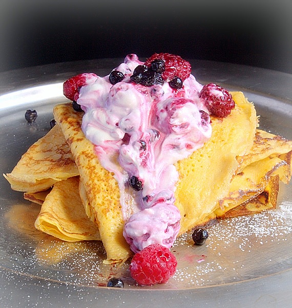 - Wymieszaj owoce z serkiem i podawaj z nalesnikami. Posyp cukrem pudrem.