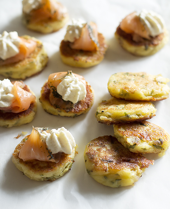 Ugotowane ziemniaki obierz ze skórki i zetrzyj na tarce. Wymieszaj z pokruszoną feta, cebulą, pietruszką i żółtkami. Formuj małe placuszki i smaż na małym ogniu po obu stronach. Lekko ostudź. Ubij śmietanę i wymieszaj z utartym chrzanem. Napełnij szprycę. Na każdy placuszek ułóż po kawałku łososia, a następnie udekoruj rozetką ze śmietany.