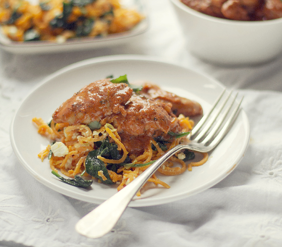 Zapraszam na kolejny, smakowity przepis z kurczakiem w roli głównej. Tym razem trochę na przekór klasyce – zamiast ryżu, kaszy czy pieczonych ziemniaków, postawiłam na nudle z batatów. Tak, dobrze czytasz – warzywne spaghetti z batatów! Ostatnio totalnie przepadłam za tymi kolorowymi nitkami i dziś nadszedł czas, żeby połączyć je z soczystym kurczakiem.