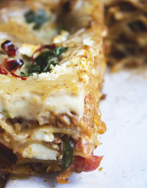 - Żaroodporną formę wysmaruj tłuszczem i układaj warstwami lasagne, sos, ser i świeżą kolendrę. Zakończ porcja lasagne. Rozsmaruj resztkę beszamelu i posyp danie chili i kolendra. Piecz lasagne w piekarniku na 160ºC, przez 30 minut.