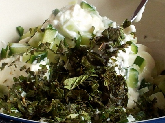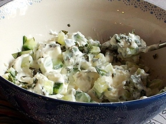 Orzeźwiająca sałatka z jogurtem, serem feta i miętą pieprzową. Sałatka pasuje jako dodatek do grila i pieczonych mięs lub jako dip do warzyw.