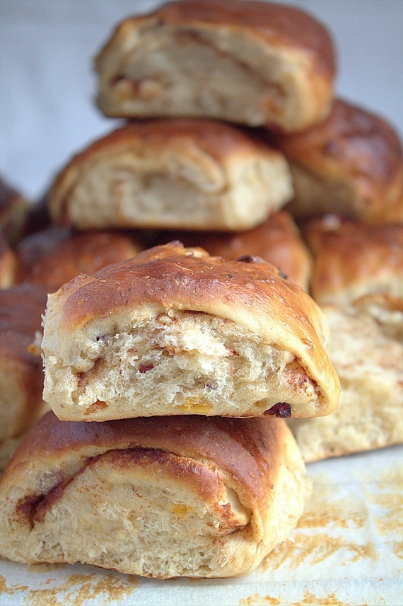 Bułeczki są typowo drożdżowe, przypominają szwedzkie bułeczki cynamonowe, ale nie są tak słodkie. Poza tym bułki upiekłam na serwatce. Dodałam również płatki owsiane, suszona żurawinę i morelę. Cynamon świetnie pasuje z suszonymi owocami, o czym się przekonałam dawno temu, czemu wiec nie wypróbować go do wypieku śniadaniowego pieczywa.