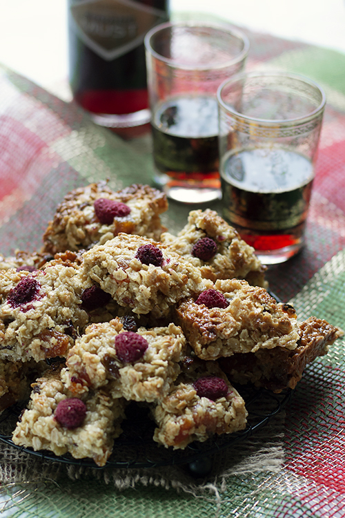 Przełóż masę do formy wyłożonej papierem do pieczenia, wygładź, ułóż maliny i wstaw do nagrzanego piekarnika na 180ºC na 15 minut. Wyjmij i pokrój od razu na małe kwadraty, po czym odstaw do ostygnięcia.