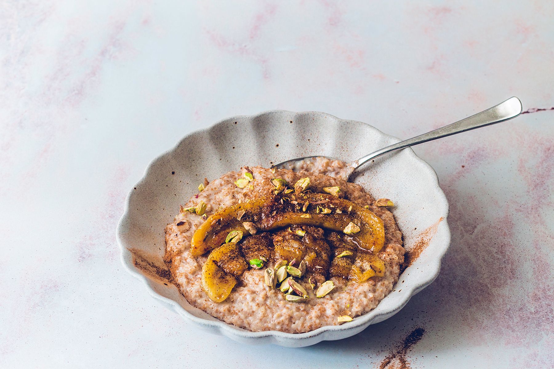 - Owsiankę przełożyć do miseczki. Na wierzchu ułożyć karmelizowane banany, oprószyć cynamonem i na koniec posypać pistacjami. Smacznego!
