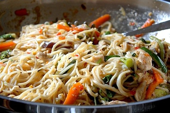 Mięso pokrój na małe kawałeczki. Białko wymieszaj z mąką kukurydzianą i dodaj do mięsa. Wymieszaj. Na rozgrzany olej wrzuć imbir, czosnek i chili, po czym mięso kurczaka. Wokuj aż mięso się lekko zrumieni. Wyjmij i trzymaj w cieple. Teraz wokuj warzywa. Zacznij najpierw od bakłaża, potem dodaj resztę warzyw. Dodaj mięso, soję i chili i ugotowane nudle. Być może potrzebujesz dodać więcej soi, aby woke był wystarczająco osolony. Wymieszaj. Na końcu dodaj grubo pokrojoną kolendrę.