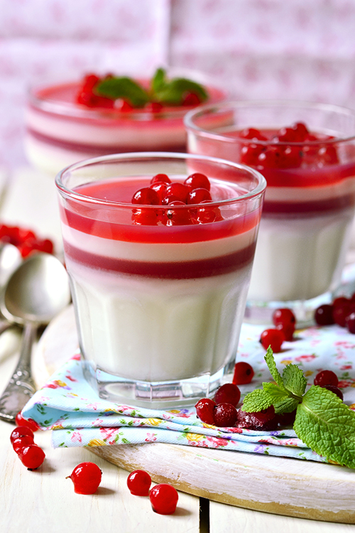 Żelatynę namocz w 3 łyżkach zimnej wody. Natnij wzdłuż waniliową laskę, wyskrob nasionka. Zagotuj mleko z cukrem, laską wanilii i nasionkami. Odstaw na 30 minut. Po tym czasie przelej mleko przed sito. Dodaj śmietankę i zagotuj. Dodaj teraz napęczniałą żelatynę i mieszaj do rozpuszczenia. Odstaw do ostygnięcia. Przestudzoną mieszankę wymieszaj z jogurtem i napełnij na przemian z prawie zastygającą galaretką. Udekoruj lekko zmrożonymi porzeczkami.