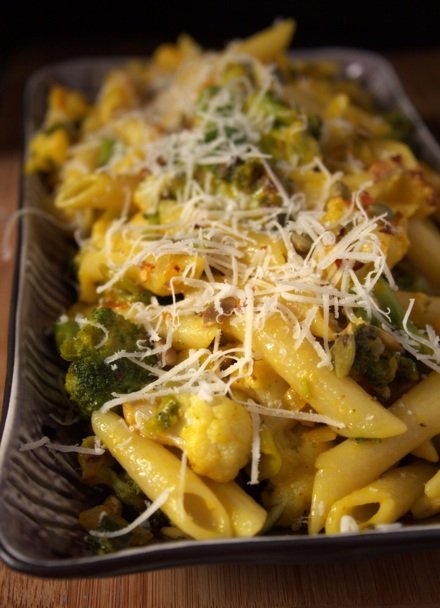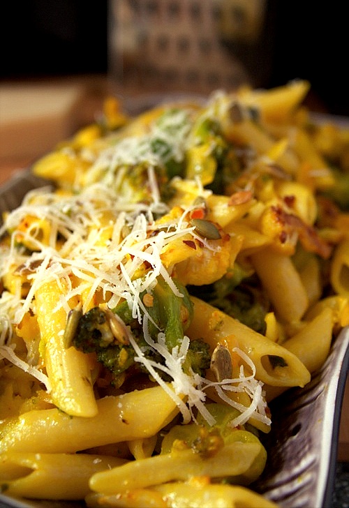 Przepis na penne z brokułami i kalafiorem w szafranowym sosie