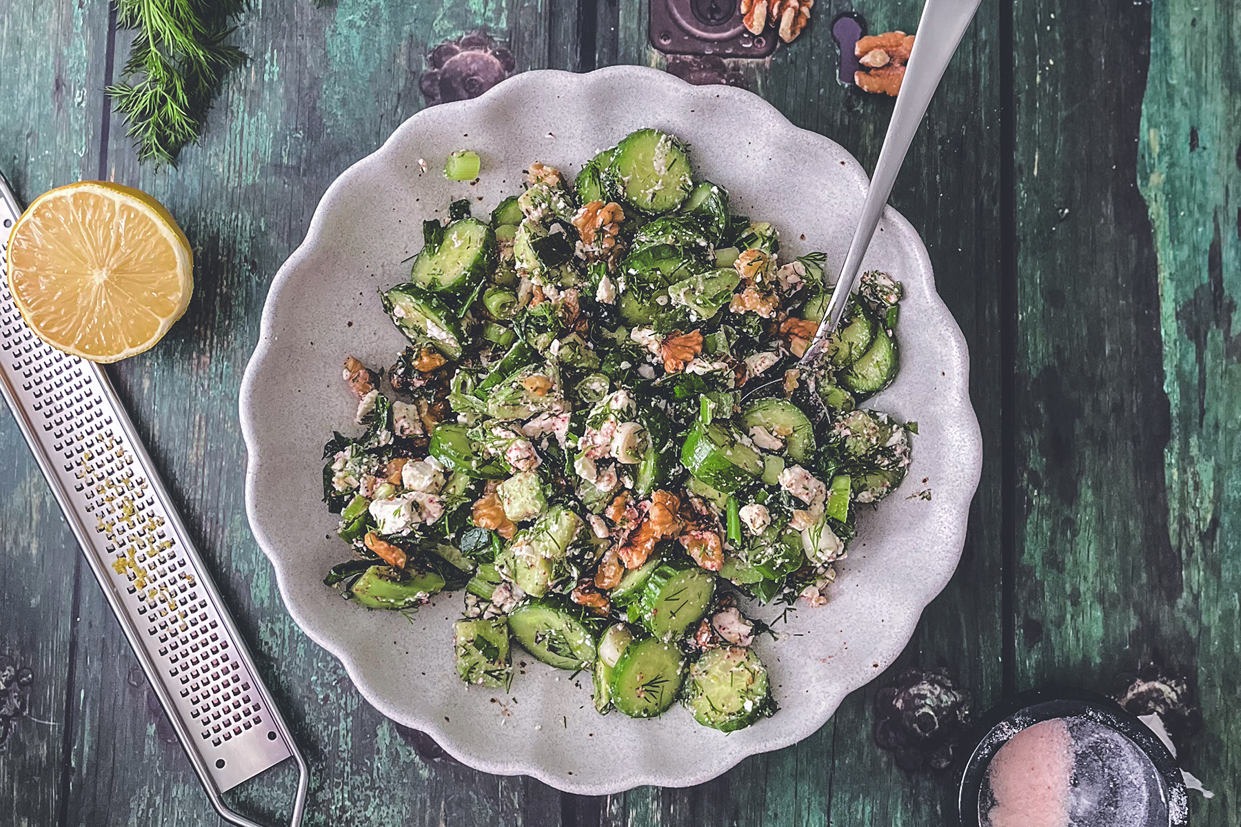 5 małych ogórków 1 pęczek świeżego kopru 1 pęczek mięty pieprzowej 3 dymki 1 awokado garść orzechów włoskich 100 g feta sól do smaku 1 łyżka sumaku 1 łyżeczka czarnego pieprzu, grubo mielonego otarta skórka i sok z 1 cytryny 50 ml oliwy z oliwy![]()