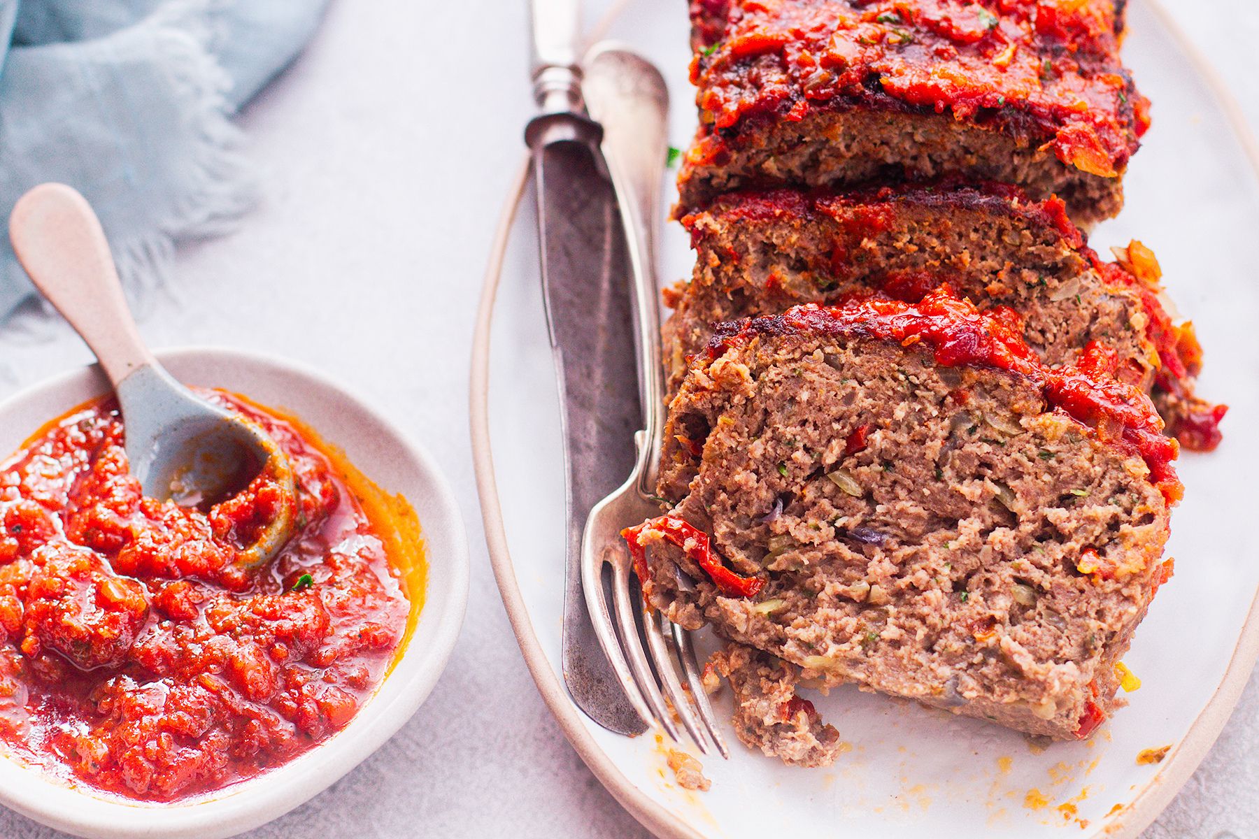 Tak czy inaczej, dziś polecam przepis na pieczeń rzymską w stylu śródziemnomorskim – z suszonymi pomidorami, oregano i sosem pomidorowym marinara. Wybrałam mieszankę mielonego mięsa – pół na pół wieprzowinę i wołowinę. Dodałam też sporo cebuli, którą wcześniej zeszkliłam na oleju z przyprawami, by podkreślić smak dania.