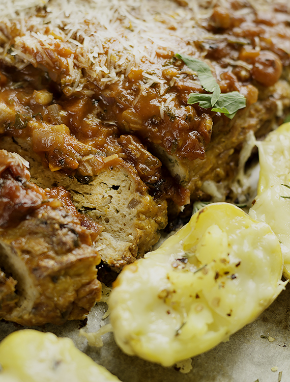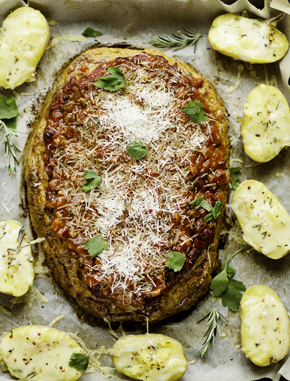 Ugotuj pomidorowy sos z przepisu w linku. Odstaw do wystygnięcia. Wymieszaj składniki na farsz. Dodaj połowę sosu i jeszcze raz wymieszaj. Blaszkę z piekarnika przykryj papierem do pieczenia. Uformuj pieczeń w kształcie bochenka. Na wierzchu rozprowadź resztę sosu. Wstaw pieczeń do nagrzanego piekarnika na 160ºC na termoobiegu i piecz przez 40 minut. Ugotuj ziemniaki w mundurkach w lekko osolonej wodzie. Odcedź, lekko ostudź i rozerwij na dwie połówki. Wyjmij blachę z pieczenią, ułóż ziemniaki wokół pieczeni. Posyp ziemniaki utartym serem, posiekanym rozmarynem i ewentualnie morską solą. Wstaw wszystko do piekarnika. Ser powinien się jedynie lekko stopić. Wyjmij pieczeń z piekarnika. Posyp resztką utartego parmezanu i pietruszką. Podaj pieczeń z pieczonymi ziemniakami.
