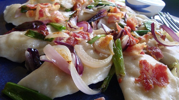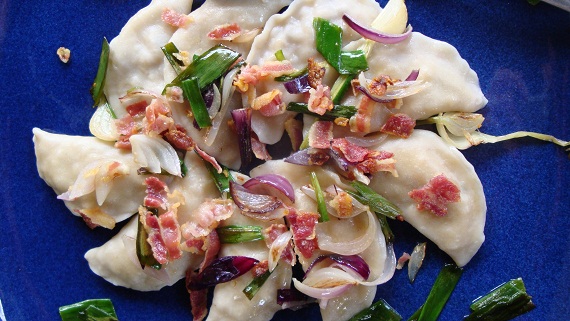 - Ugotowane pierogi podawaj z usmażonym boczkiem i cebulą.