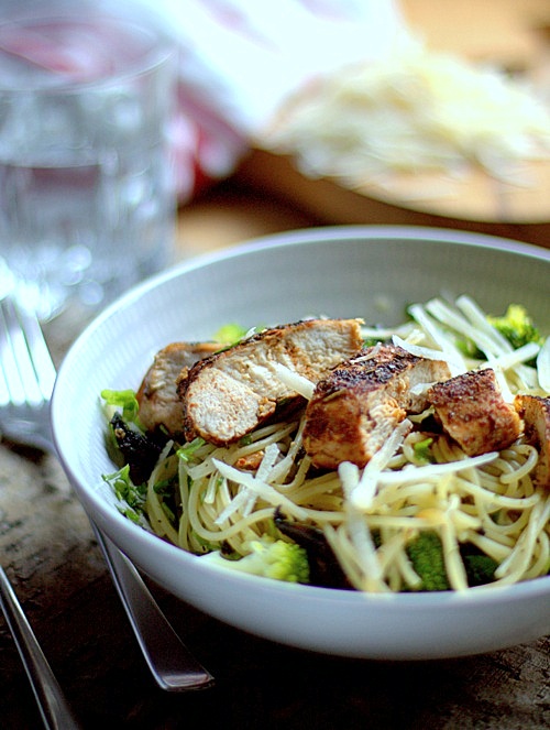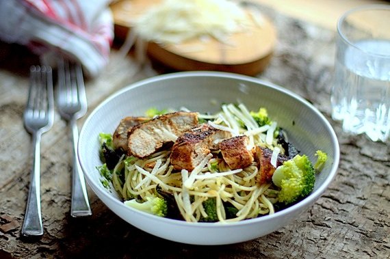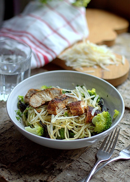 Pierś z kurczaka zamarynowałam suszonymi ziołami i słodką papryką. Wrzucona na rozgrzaną patelnię była już gotowa po paru minutach. W międzyczasie makaron bulgotał radośnie w garnku obok. Odgłos rozkładanych talerzy na stole od razu przywołał przywołał rodzinkę do kuchni…