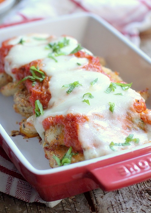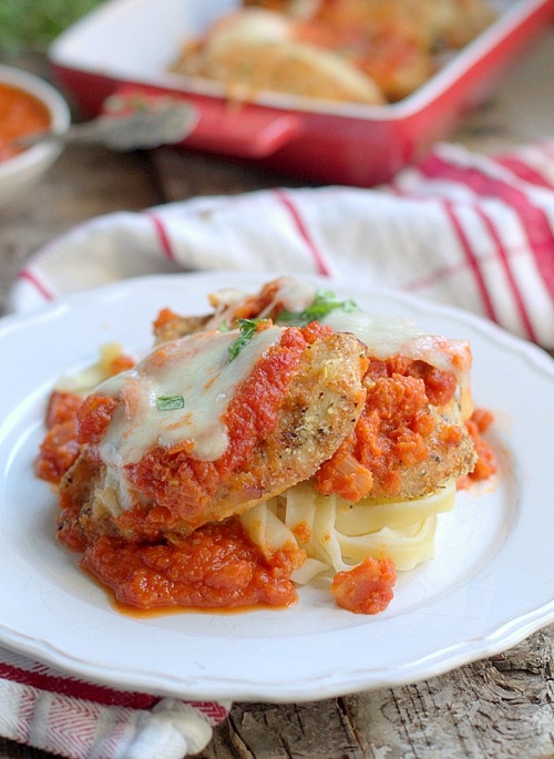 Obiad z kurczaka to najpopularniejszy obiad w moje rodzinie. Jest tyle możliwości przyrządzenia różnych dań z kurczaka, że trudno by kurczak kiedykolwiek nam się znudził. Dzisiaj kolejna propozycja na szybki obiad z kurczakiem w roli głównej, pierś z kurczaka zapiekana z mozzarella, którą podałam z makaronem. Pyszny obiad, soczyste mięso panierowane w parmezanie, aromatyczny pomidorowy sos i mozzarella….wszystko to przyrządzone zaledwie w godzinę! Zwinna jestem, prawda!