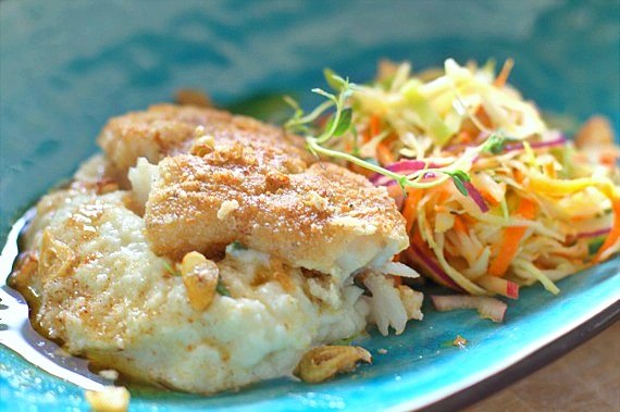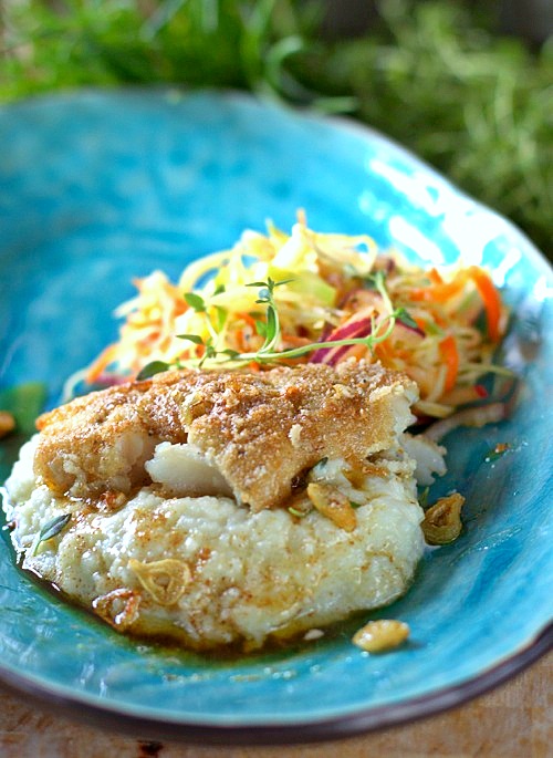 A co będziemy gotować we wrześniu? Sądzę, że fajnym tematem są ryby i owoce morza. W mojej rodzinie jadamy ryby przynajmniej 2 razy w tygodniu. Krewetki i raki również często goszczą na naszym stole. Nigdy jeszcze nie przyrządzałam małży, ale zajadam się nimi w mojej ulubionej włoskiej restauracji. Jestem praktycznie skłonna spróbować każde danie z ryby…Próbowałam szwedzkie śledzie kwaszone, których zapach odrzuca człowieka na odległość, mój mąż raczył mnie suszoną rybą po persku, jadłam suszone krewetki, kalmary w cieście, marynowane ośmiornice. Dzisiaj natomiast polecam przepis na dorsza w nie tradycyjnym wykonaniu. Przyrządziłam dorsza panierowanego w mące migdałowej, którego podałam z kalafiorowym purée na maśle i czosnku oraz polską tradycyjną coleslaw z białej kapusty z jabłkiem, cebulą i marchewką. Bardzo polecam!