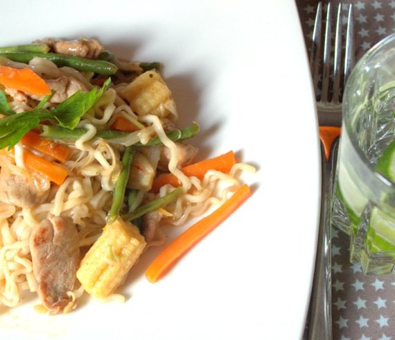Szybko, szybko, szybko… uwielbiam szybkie obiady jak polędwiczki wieprzowe słodko kwaśne. Za nim otworzyłam lodówkę nie miałam pojęcia co ja dziś zrobię na obiad. W zamrażalce odkrywam kawałek polędwicy wieprzowej, trochę mrożonej fasolki… a w kuchennej spiżarni puszki z kiełkami i mini kukurydzą oraz nudle.