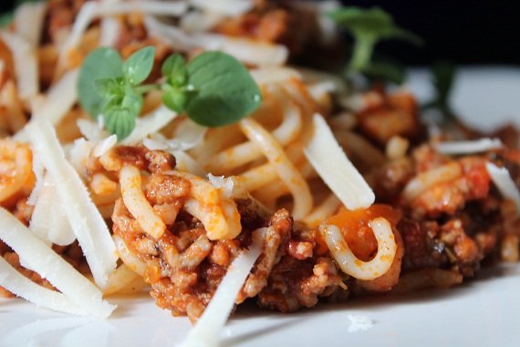 Prawdziwe spaghetti bolognese zawiera zawsze marchewkę i seler. Moje dzisiejsze spaghetti dosmakowałam czerwonym winem i utartą gałką muszkatałą. Zamiast bazylii postanowiłam przyprawićsos suszonym oregano. Użyłam również prawdziwego włoskiego boczku, pancetta.