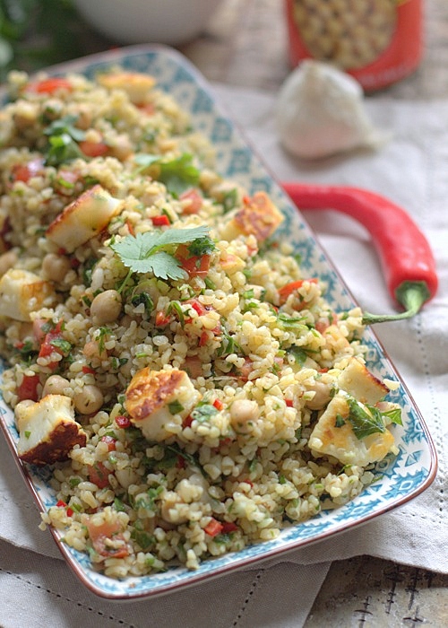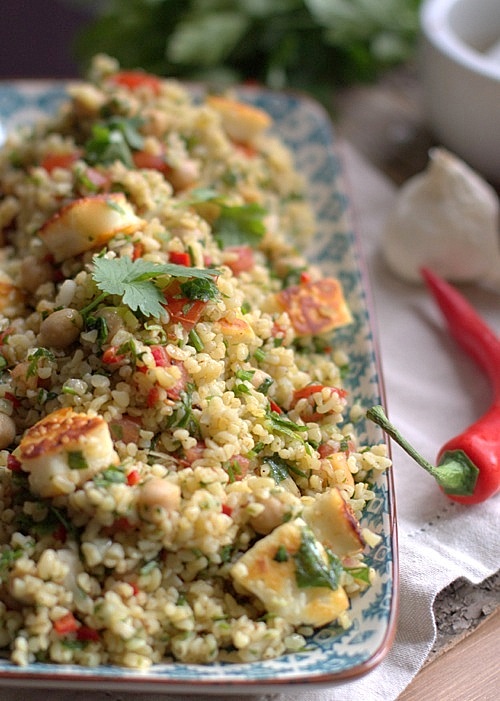 Ugotuj bulgur w bulionie i odparuj. Pokrój dymki w kostkę. Przeciśnij czosnek przez praskę. Pokrój kolendrę. Oczyść chili z nasion i gniazdek i pokrój w drobną kostkę. Wyciśnij sok z cytryny. Wszystkie warzywa, zioła i przyprawy wymieszaj z sokiem z cytryny i oliwą. Dopraw solą i pieprzem. Nie za dużo soli, bo halloumi jest dosyć słone. Odcedź i opłucz ciecierzycę. Dodaj do sałatki.