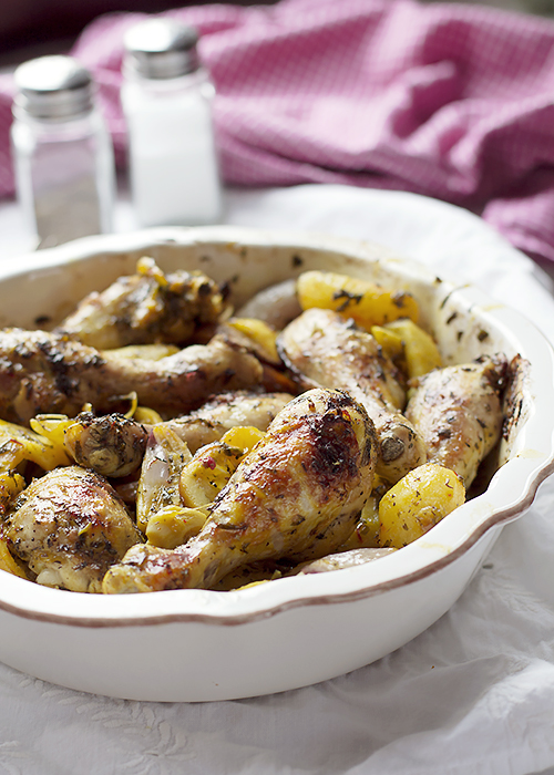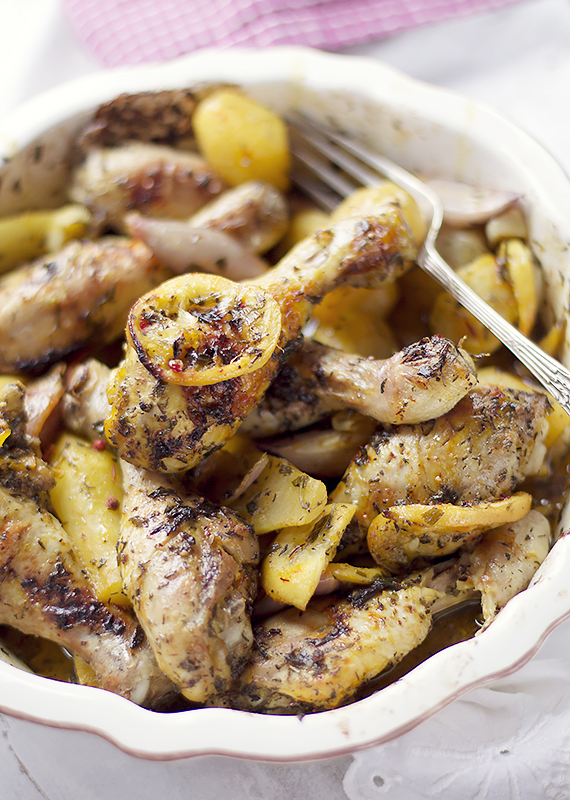 Obierz topinambura i gotuj w lekko osolonej wodzie prze 5 minut. Szalotki jeśli duże podziel na ćwiartki, a czosnek na grube plasterki. Gałązki estragonu obierz z liści, a same liście z grubsza pokrój. Do sporej miski wrzuć wszystkie przyprawy, zioła, szalotki, czosnek, odcedzony topinambur,pokrojoną w plasterki cytrynę, wlej oliwę i wymieszaj. Dodaj kurczaka, posól i jeszcze raz wszystko wymieszaj najlepiej rękoma. Ułóż wszystko w żaroodpornej misce, podlej wrzątkiem i piecz przez 45 minut w nagrzanym piekarniku na 175ºC na termoobiegu. Jeśli danie za bardzo się rumieni, przykręć piekarnik. Podaj danie z sałatka ze świeżych warzyw.