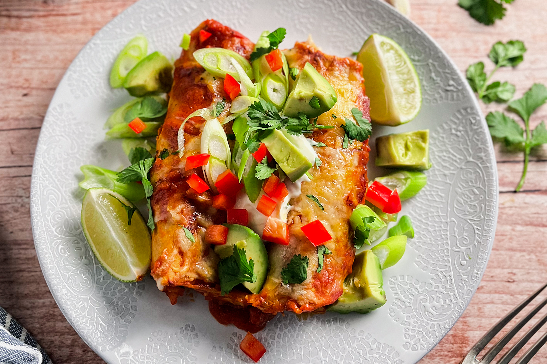 Lubię kuchnię meksykańską za świeże, kontrastujące dodatki, które doskonale przełamują sycące, zapiekane dania. Podając dzisiejsze enchiladas, nie mogłam więc pominąć kremowego awokado, dymki pokrojonej w cienkie piórka, limonki ani delikatnie kwaśnego crème fraîche, który idealnie równoważy intensywny smak sosu.