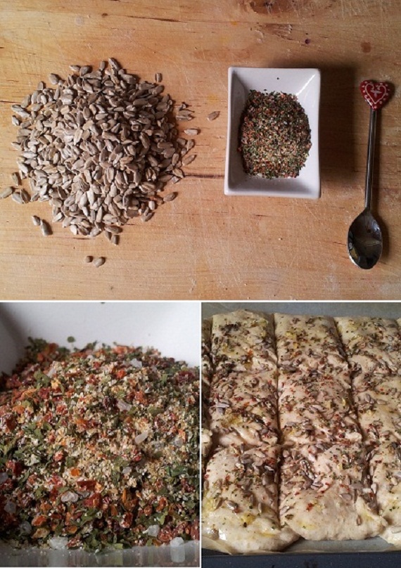 Drożdże rozpuść z podgrzanym mleku z dodatkiem syropu. Dodaj sól, oliwę z oliwek i obie mąki i zagnieć elastyczne ciasto. Pozostaw do wyrośnięcia na 30 minut, a następnie ukształtuj ciasto w prostokąt, o grubości 2 cm i umieść w dużej brytfance do pieczenia wyłożonej pergaminem.